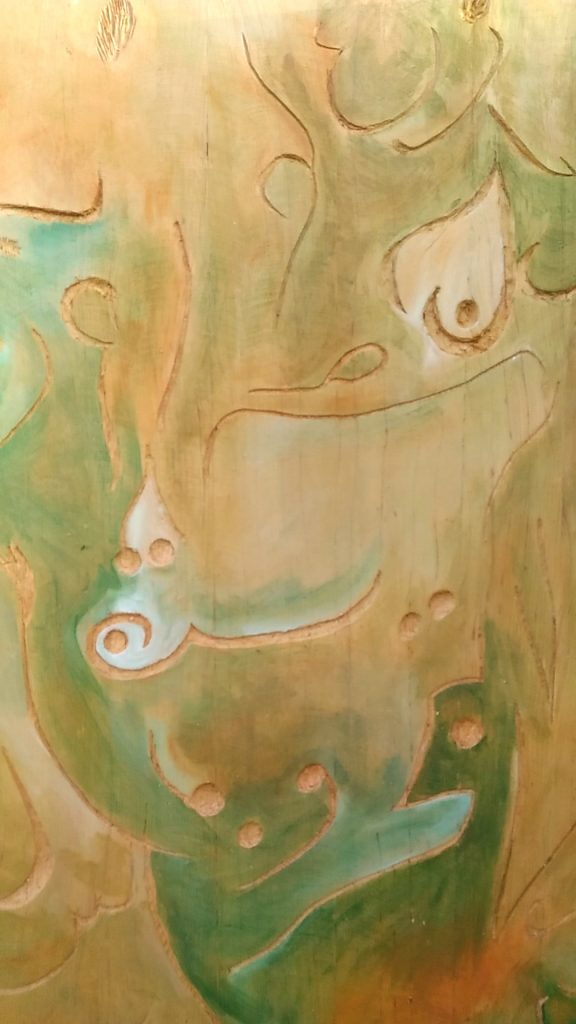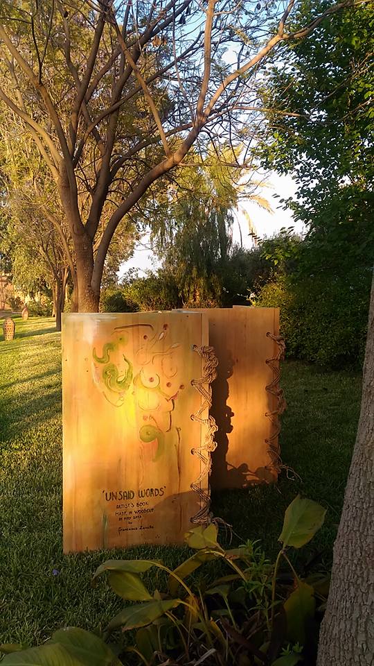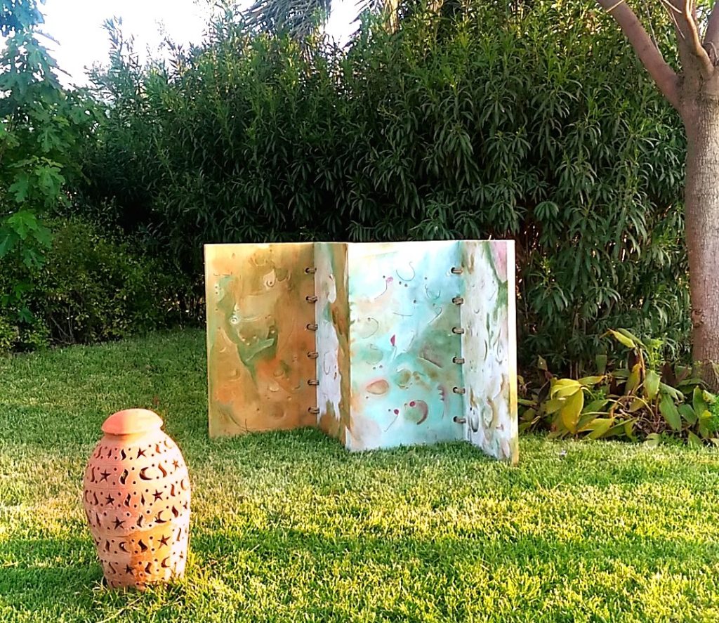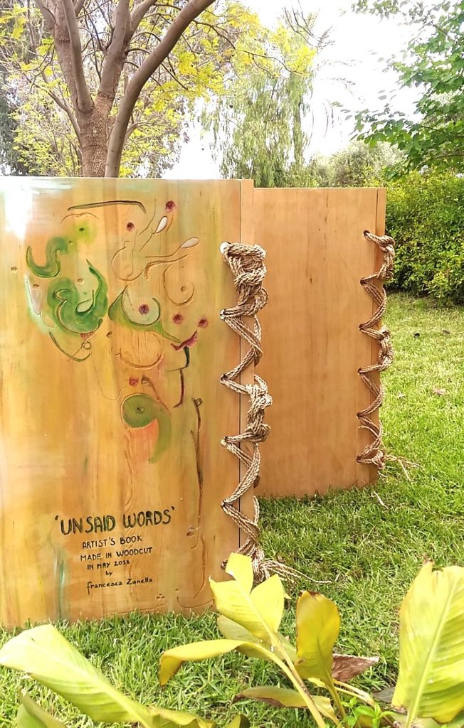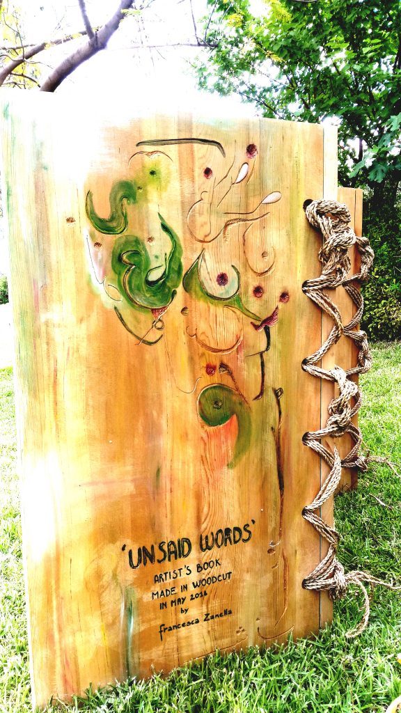 Libro d’artista in legno di cedro a fisarmonica, si compone di quattro pannelli tenuti insieme da una rilegatura a corda. Xilografia ed acrilco, cm 260×120.